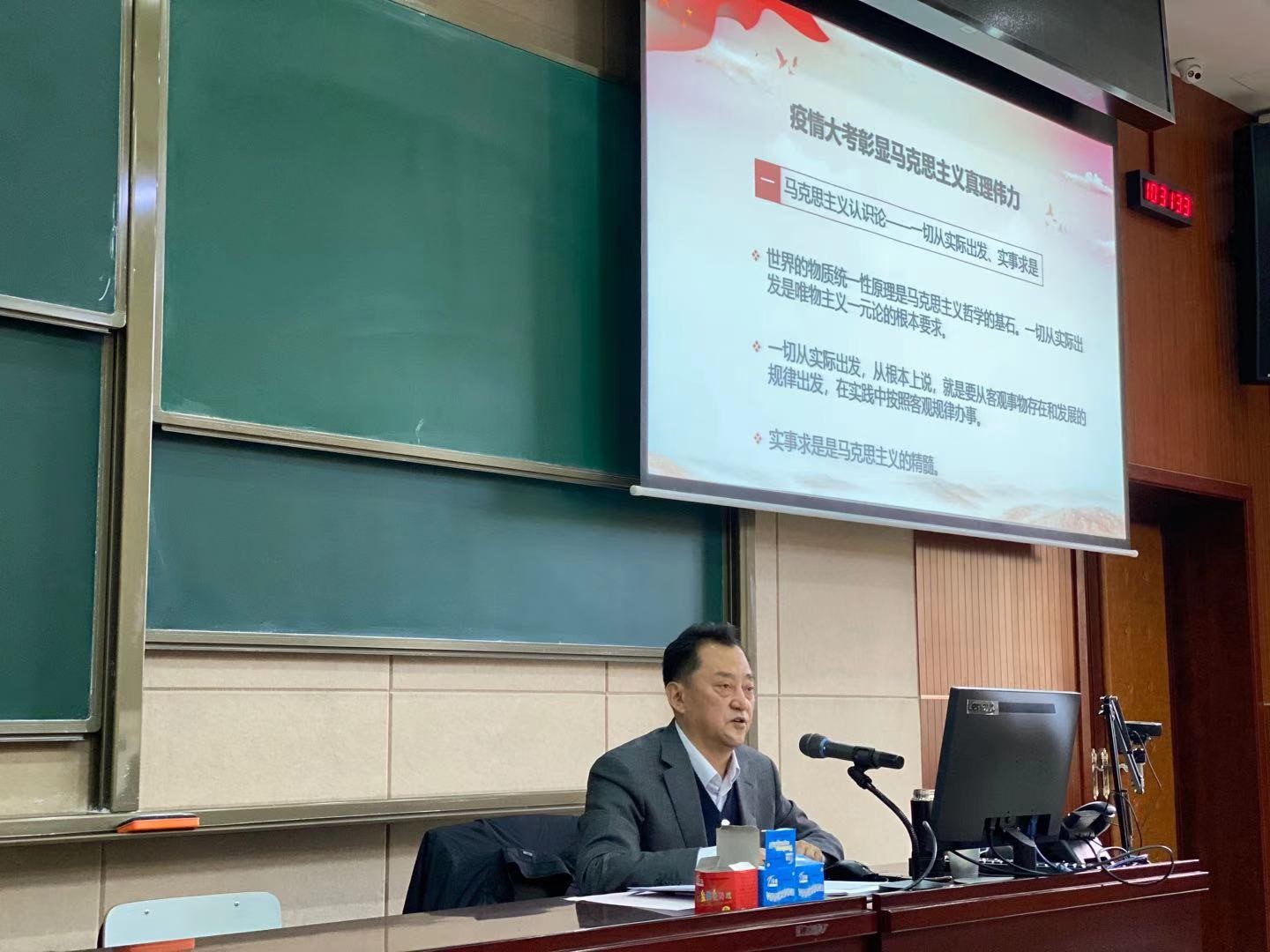 11月20日,主南102教室座无虚席,校党委书记倪海东同志在此为信息科学学院20级本科生以“疫情大考彰显马克思主义真理伟力”为题讲授了一堂精彩的思政课。