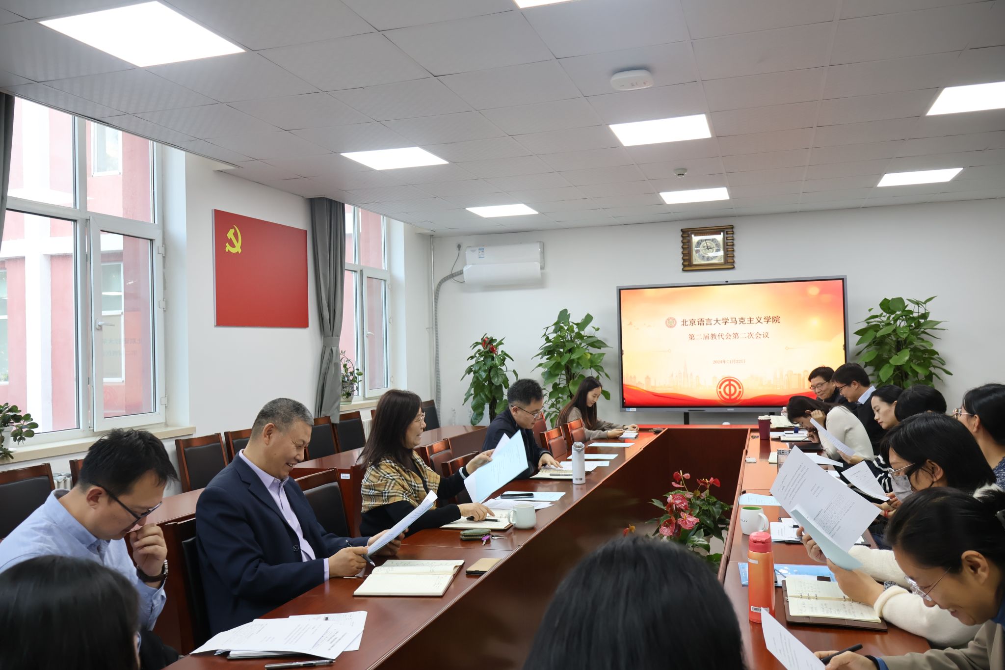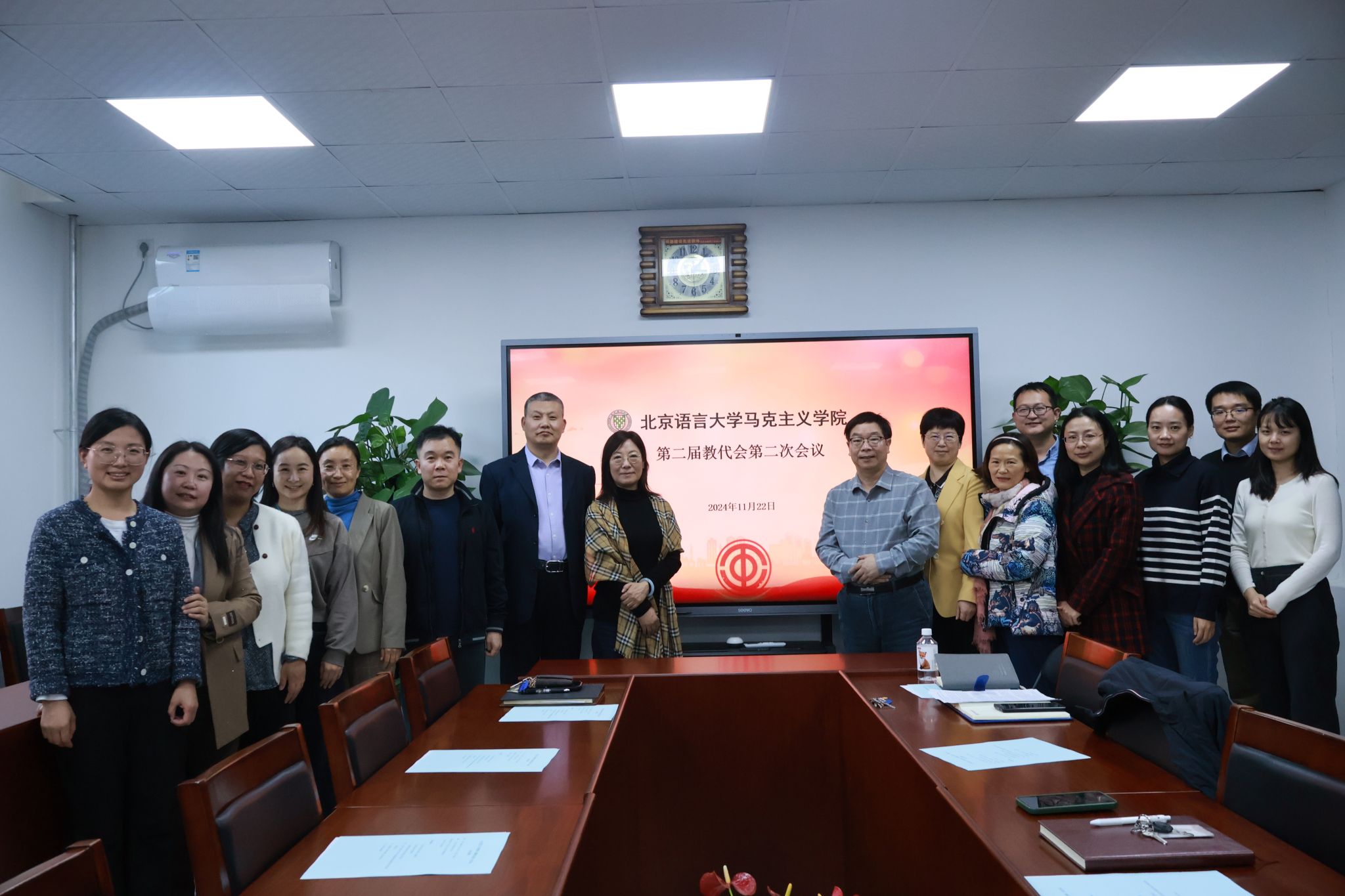 2024年11月22日下午,马克思主义学院第二届教代会第二次会议在教二楼227举行。本次教代会严格按照《北京语言大学二级教职工代表大会条例》以及校工会相关通知要求执行。会议审议并通过了学院年度各项工作报告以及《马克思主义学院一线思政课专职教师岗位补贴发放实施办法》。会议由学院直属工会小组组长杜运辉主持,党总支书记丁文阁、党总支副书记杨林坡、副院长贾甫以及全体教职工参加了本次会议。
