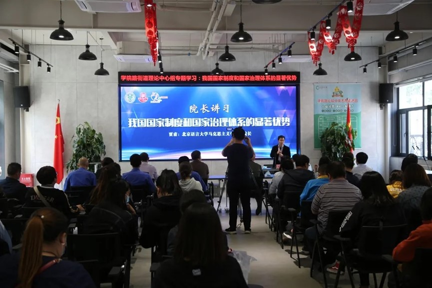9月30日上午,学院路街道在新时代文明实践所开展理论中心组专题学习暨2020年百姓宣讲之“院长讲习”系列活动。“学院路街道马克思主义学院院长宣讲团”成员、北京语言大学马克思主义学院副院长贾甫受邀为大家解读“我国国家制度和国家治理体系的显著优势”。