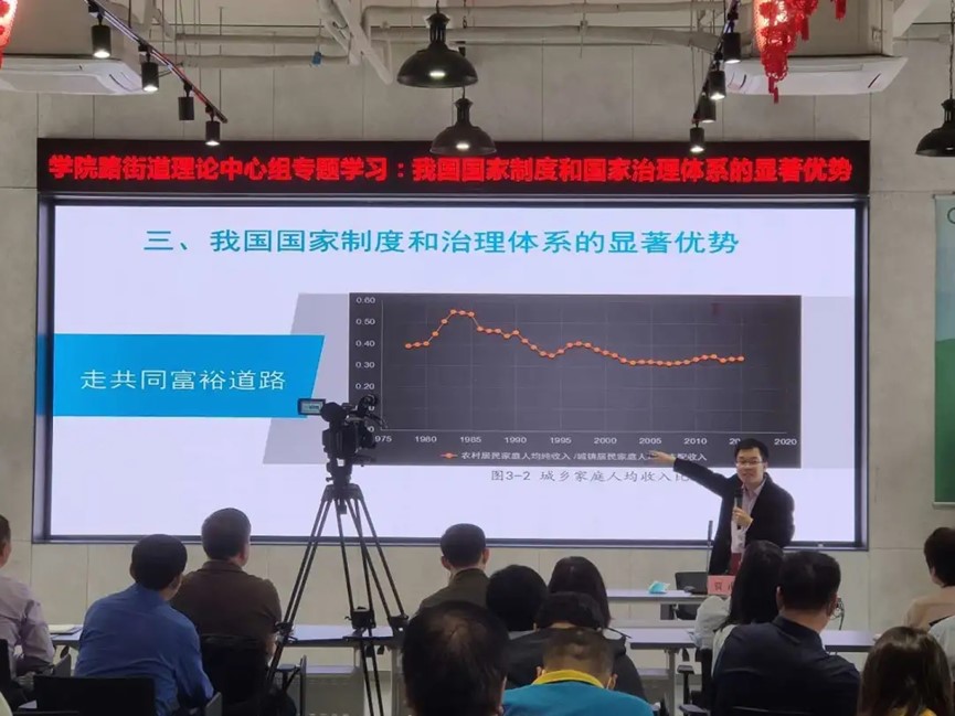宣讲中,贾甫从“新冠疫情带给我们的思考”引入,运用大量数据,从历史、国际的角度,对比分析了中国及世界经济增长,指出我国取得的世所罕见的经济快速发展奇迹和社会长期稳定奇迹,特别是面临突如其来的全球重大公共卫生事件冲击,我国的疫情防控和经济恢复走在世界前列,充分体现了我国国家制度和国家治理体系的显著优势。最后,贾甫从中国共产党的集中统一领导、全国一盘棋、社会主义基本经济制度、走共同富裕道路和选贤任能等五个方面,重点分析了国家治理体系和治理能力现代化的逻辑。