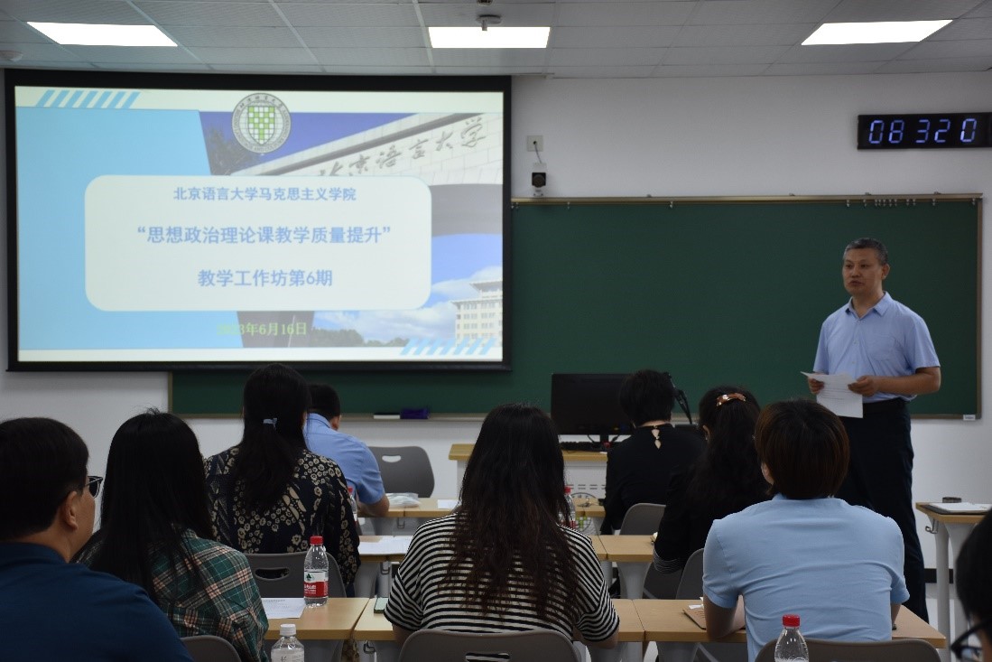 为进一步深入探究思想政治理论课教学规律,切实提高思政课教学实效,帮助青年思政课教师快速成长,2023年6月16日上午,马克思主义学院举办“思想政治理论课教学质量提升”第六期教学工作坊。北京师范大学马克思主义学院副院长刘洪森副教授、北京第二外国语学院马克思主义学院副院长宋振美教授、北京语言大学国际中文学院院长沈庶英教授、北京语言大学应用中文学院院长苏英霞教授、北京一零一中石油分校(北京语言大学附属中学)曾丽军书记、任晓娜老师、肖莹老师、北京石油学院附属小学(北京语言大学附属小学)康莉老师及马克思主义学院全体教师出席。教学工作坊由马克思主义学院院长杜运辉教授主持,学院党总支书记丁文阁教授作致辞。