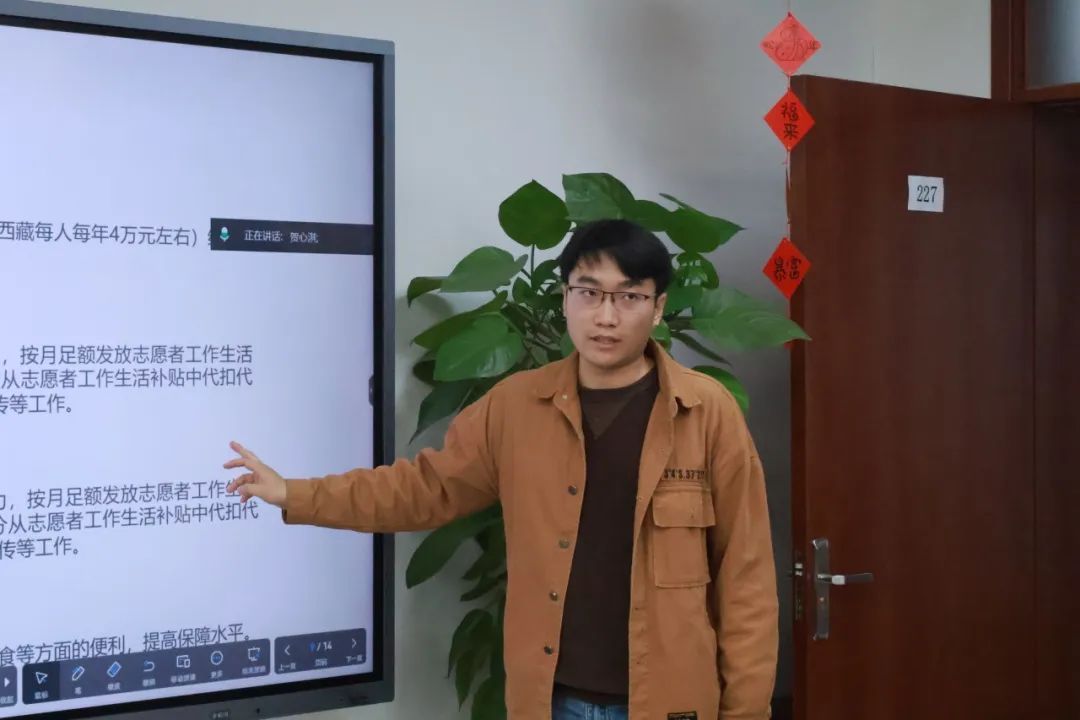 会议伊始,魏光裕同学为大家详细解读了西部计划的核心内容。 从乡村教育的振兴蓝图,到健康乡村的建设目标,从基层青年工作的创新路径,再到乡村社会治理的优化策略,他全面讲解了2025年西部计划涵盖的八大专项任务,介绍了新疆、西藏、内蒙古等西部省区的服务需求与挑战,同时他重点强调了国家为志愿者提供的多项政策支持,政策涵盖保险、学业激励、就业等权益,让志愿者无后顾之忧投身西部计划。