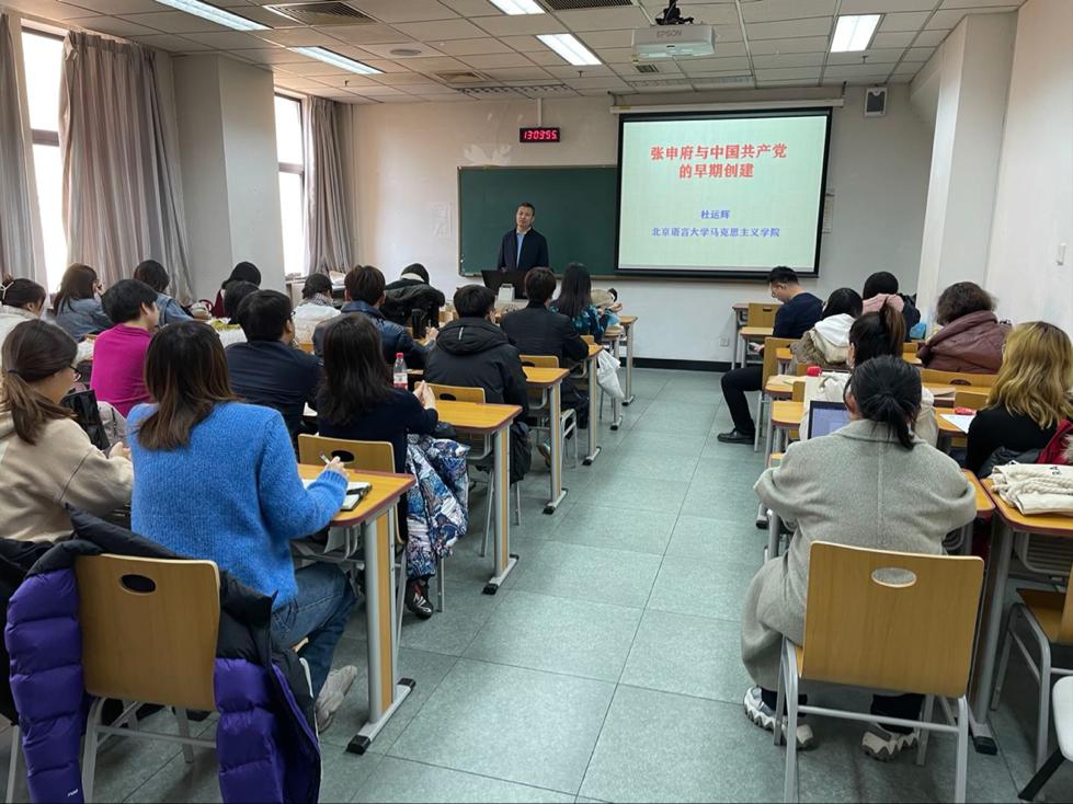 2020年12月11日中午,马克思主义学院教工党支部在教一楼212举行“学习党的十九届五中全会精神”系列党课公开课第二讲,马克思主义学院研究生党支部、心理学院直属党支部、培训学院出国部教师党支部师生共同参加学习。党课由马院党总支副书记杜运辉教授主讲,题目是“张申府与中国共产党的早期创建”。