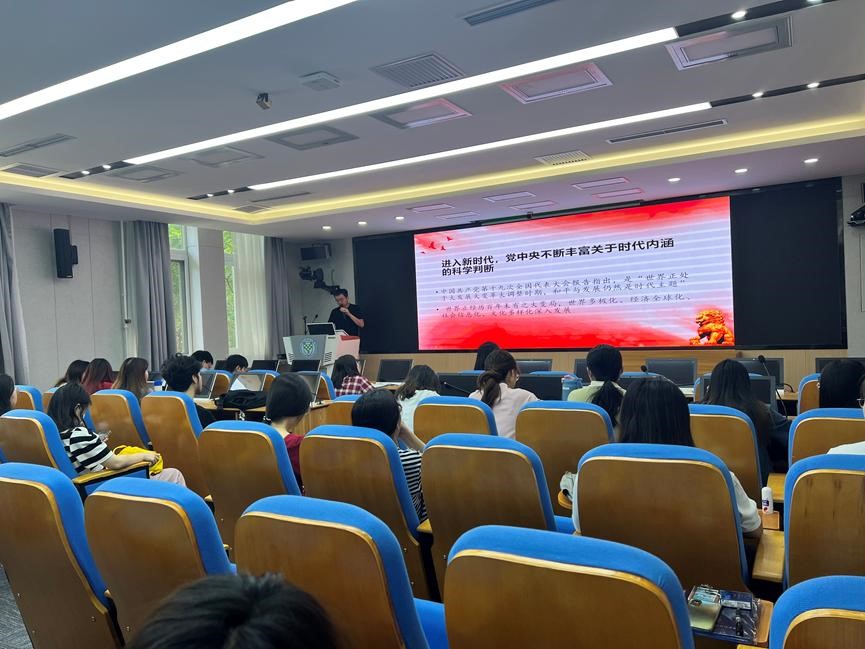 为推动主题教育有力开展,引导广大青年学生全面深刻领会党的二十大精神,6月7日上午,马克思主义学院冷鸿基老师为外国语学部学生第十四党支部(研究生小语种笔译党支部)的党员和积极分子讲授党课。外国语学部党委副书记冯会茹,研究生辅导员李林凤参加了本次党课。