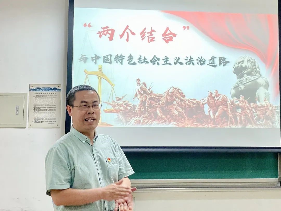 6月16日下午,学校党委宣传部联合马克思主义学院开展的“学思想 强党性 传精神”系列党课第18讲在教四楼105举行。马克思主义学院副教授孙迎春老师给国际关系学院师生党员讲授了一堂“‘两个结合’与中国特色社会主义法治道路”的主题党课。本次主题党课由国际关系学院党总支书记王秋生主持。