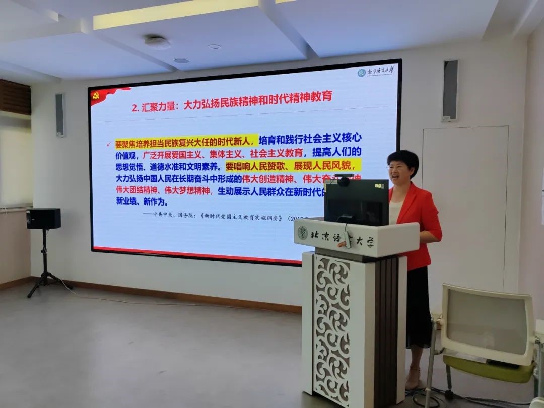 李老师从新时代爱国主义教育的根本遵循、新时代爱国主义教育的基本内容、新时代爱国主义教育的实践路径三个部分给大家进行了讲述。首先讲述爱国主义的基本属性、本质特征、鲜明主题、根本立场,阐明了爱国主义是社会主义价值观中最深层、最根本、最永恒的精神,而实现中华民族复兴的中国梦,就是当代中爱国主义的鲜明主题,人民立场是爱国主义教育的根本立场。那么,新时代爱国主义教育的基本内容主要有哪些呢?李老师总结出“以思想政治教育强化爱国自觉,以国情形势教育激发爱国热情,以历史传统教育传承爱国基因、以国家安全教育筑牢爱国防线”四个方面的教育内容。如何让深化新时代的爱国主义教育?李老师说,可以从“教育引导为主要方式、阵地建设时基础工程、载体建设是关键支撑、氛围营造是重要举措”这四个实践途径来开展。讲授过程中,李老师既引用了习总书记近年来关于爱国主义教育的重要讲话,也结合自己的研究成果,同时还列举我们北语开展爱国主义教育的成功案例,既有理论的高度和严谨的研究,又不乏生动的案例,论述激情澎拜,也进一步激发了在座师生内心的爱国热情。讲座结束后,党员师生报以热烈的掌声。