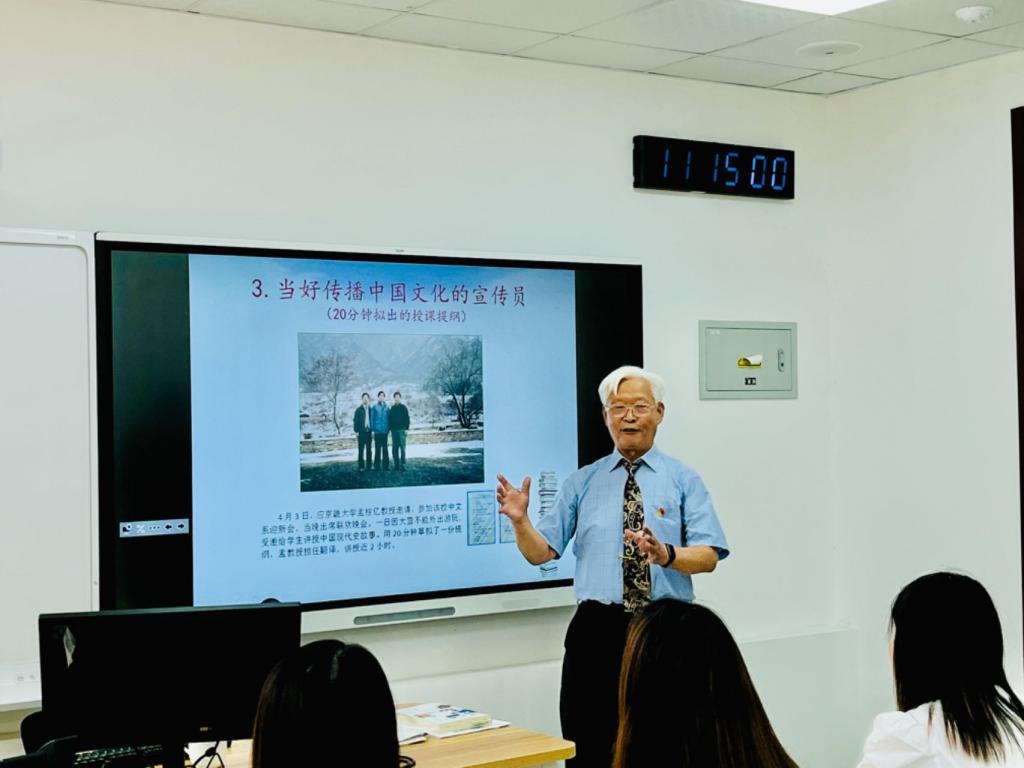 刘士勤老师1939年2月出生,1964年起在北京语言学院(现北京语言大学)执教。在近60年的国内外从教生涯中,刘老师主编多部汉语国际教育实用教材、教学考试大纲,编纂多部工具书,撰写论文数十篇,所教学生遍布五大洲,其中包括哈萨克斯坦共和国总统托卡耶夫等政要及汉学家。刘老师的党课以“北语一兵纪事”为主题,从北语建校和汉教事业发展的见证者、亲历者、实践者的角度,介绍北语60多年来发展壮大的奋斗历程,讲述老一辈汉教人是怎样伴随政治进步的“人生三部曲”走上献身“国家和民族的事业”之路、凭借坚定的理想信念从无到有地开创特色课程的光辉事迹。刘老师以自己出国执教的亲身经历告诉学生,在中外文化交流中应该担当汉语授课的好教员、答疑解惑的解说员、传播中国文化的宣传员、牵线搭桥的联络员的“四员”使命,他与托卡耶夫总统真挚的师生情谊就是最集中的体现。刘老师的党课使学生认识到:为了使世界“读懂中国”,我们自身须秉持坚定的理想信念,以过硬的政治品格、高昂的精神面貌、不畏艰难困苦致力于教学实践。刘老师虽已退休,但仍心系教育事业,积极撰文、讲学,宣传介绍北语校史。
