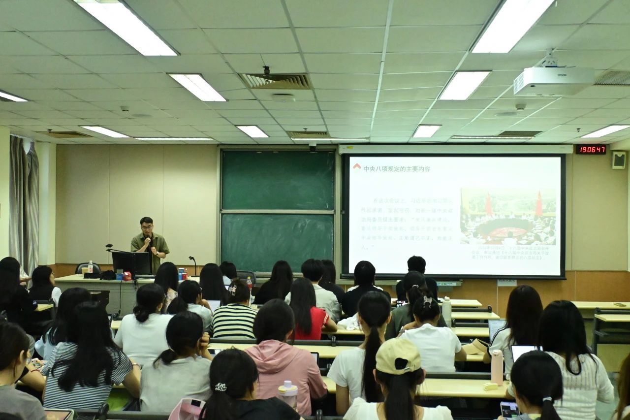 为深入贯彻中央八项规定精神学习教育,提升青年大学生对中央八项规定精神的理解与践行能力,马克思主义学院研究生理论宣讲团筹划了以“理解和践行中央八项规定精神”的系列宣讲活动。2025年5月28日,马克思主义宣讲团受邀为校研究生会讲述“中央八项规定精神的理论必然性”的主题党课。马院2023级研究生魏光裕同学担任本次宣讲员。此次宣讲由校研究生会组织,校研究生会全体成员参会学习。