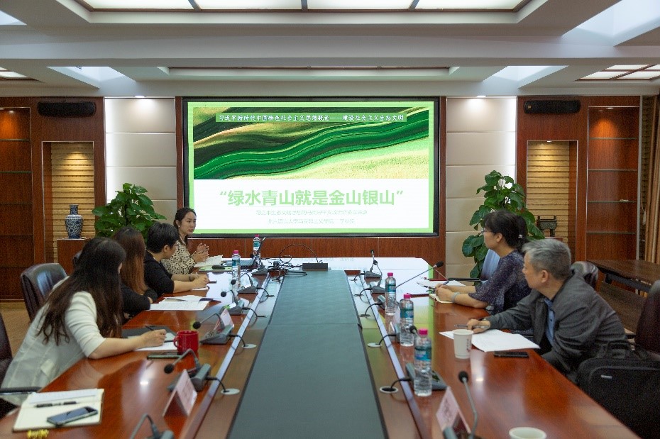 在接下来的研讨中,北京语言大学马克思主义学院李秋实老师首先介绍了大学本科思政理论课的课程体系和教学班级规模,从大学生的学缘结构、知识储备、年龄特征、学习认知和思想观念特点等角度,对比高中的思政教学进行了较为全面的学情分析。课程方面李秋实老师以大学一年级“习近平新时代中国特色社会主义思想概论”第十二讲为例,介绍了“绿水青山就是金山银山——建设社会主义生态文明”的授课思路。李老师突出北语的语言特色,在课前导入环节用三个“是”字句进行自我介绍、导入课程主题,引导学生思考“是”字前后“绿水青山”和“金山银山”在内涵和外延上的关系;课程旨在阐释习近平生态文明思想在理论、价值和实践上的三重逻辑,以史带论,梳理人类社会文明形态发展的历史线索,引导学生认识生态兴则文明兴,生态衰则文明衰这一规律;对比西方学者对现代生态危机产生机理的观点,进而重点分析习近平生态文明思想何以破解生产与自然的对立这一时代难题;“两山”理论与“生态文明建设”实践,利用生态资本保障人民群众利益的根本目的,反映了人民至上的价值取向;课程展现了以安吉余村—绿色浙江—美丽中国建设为代表的实践案例,引导学生明晰绿水青山与金山银山的内在联系,并认识到中国生态文明建设为世界贡献出破解生态危机的中国方案。