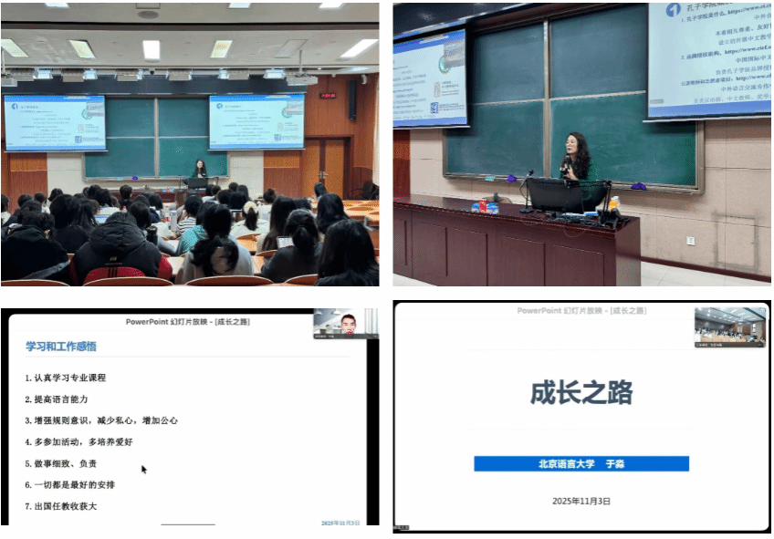 随后,北京语言大学国际中文学院副教授、埃及苏伊士运河大学孔子学院中方院长于淼,通过网络直播连线的方式分享了自己的成长与工作经历。从北语本科就读时对中文教育的初心萌芽,到研究生毕业后留校任教积累经验,再到主动请缨赴海外孔子学院担任院长,于淼老师用自身经历诠释了“把个人理想融入国家发展”的意义。他勉励同学们要珍惜在校时光,扎实学好专业知识,不断提升跨文化沟通能力,以开放的心态拥抱机遇,在服务国家对外文化交流中实现自我价值。